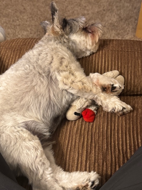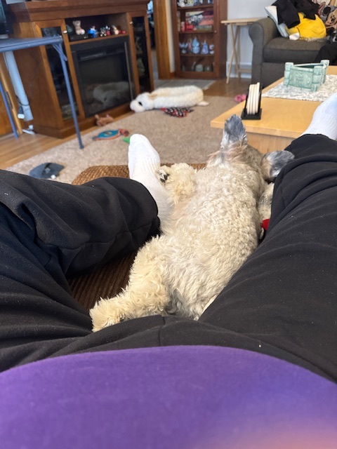 Our dog Baxter does something a little strange (to be honest, Baxter does a lot of things strange). One of his favorite places to lay is on the chair in between someone’s legs. Doesn’t matter if it is Amy’s legs or my legs, if someone is in the chair with the leg stand up, Baxter is on that chair, laying between our legs. He will paw to get up there and if Daphene dares to lay in that spot, he will get upset until we clear it so he can lay there or wedge himself back into that spot. And Baxter can lay in that spot for a long time, every now and then jumping down to make sure he has his Lamby with him (sometimes he uses it as a pillow) or maybe a bone or another toy to play with.